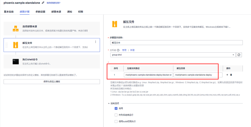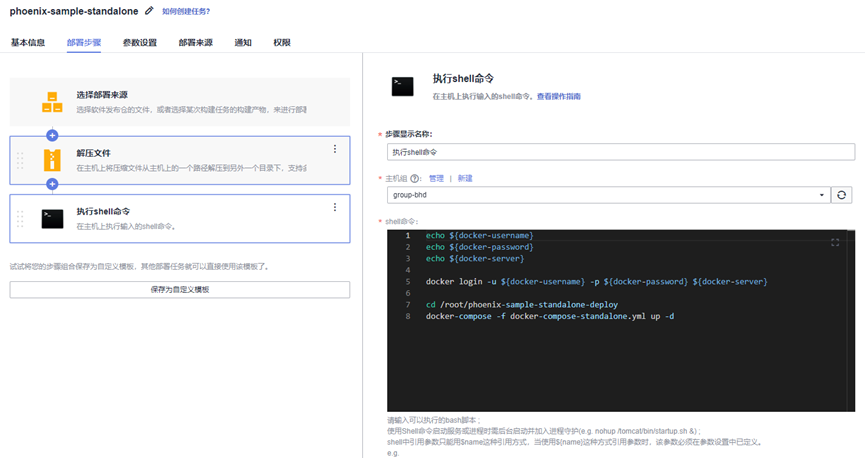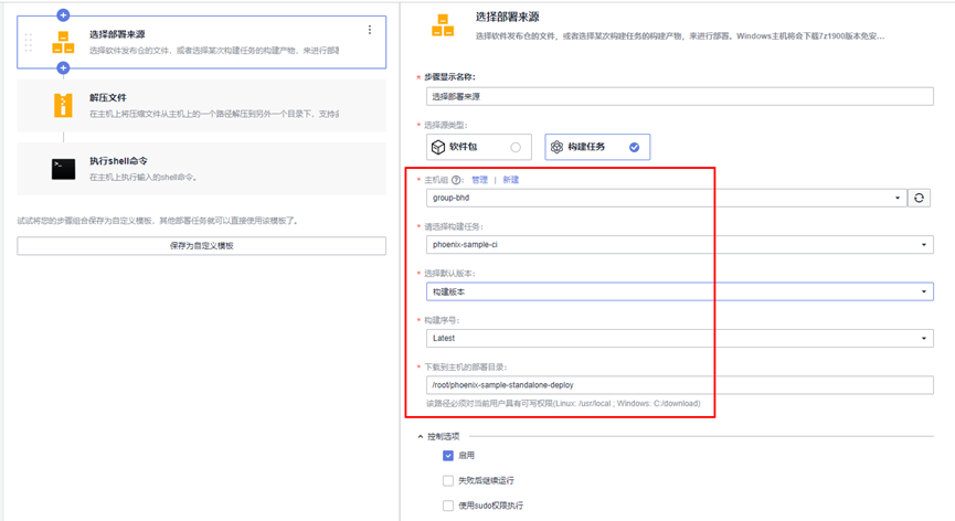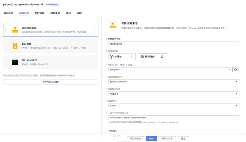 结合实际的部署任务来看,就是:向[主机组] group-bhd部署一个[软件包/构建任务(的产物)],我们选择了[构建任务] phoenix-sample-ci的最新版本([构建版本][Latest])构建产物,将其[下载到主机的部署目录]。