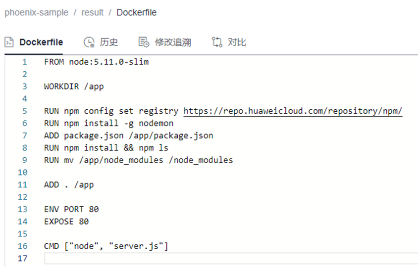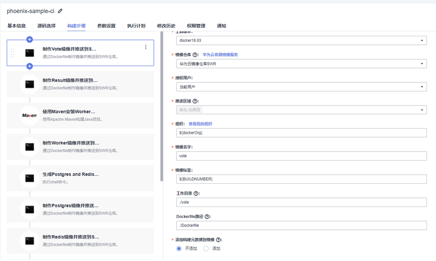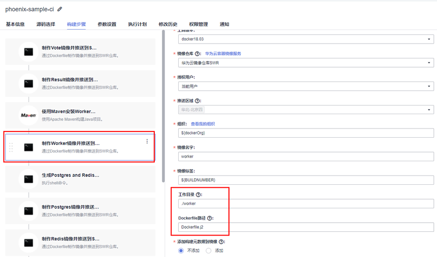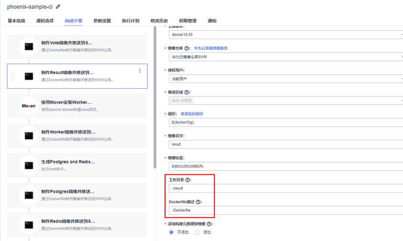 在编译构建任务phoenix-sample-ci中,“制作Result镜像并推送到SWR仓库”步骤,通过“工作目录”、“Dockerfile路径”两个选项确定制作镜像时读取的Dockerfile:<工作目录>/<Dockerfile路径>,即./result/Dockerfile。