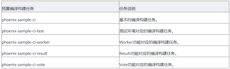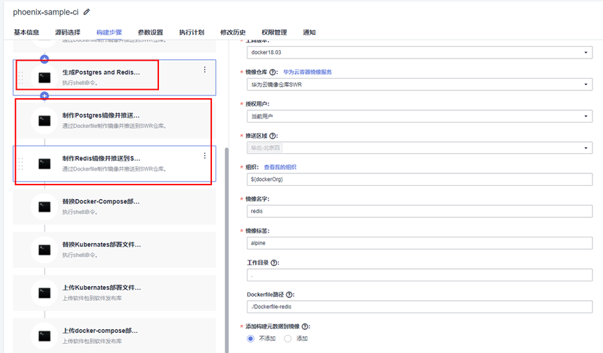 在本项目的帮助文档中,提到了“配置基础依赖镜像”。整个这一段落是由于构建任务中使用的基础镜像源DockerHub拉取受限,采取了一个折中的办法拉取镜像。简言之,整段操作即通过创建prebuild任务来实现基础镜像版本的替换,以避免开发者在进行构建phoenix-sample-ci任务时出现拉取镜像失败的情形。相应地,也在“配置并执行编译构建任务”中禁用了Postgres和Redis镜像的制作步骤。