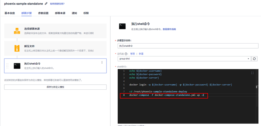这一步骤执行完毕后,在部署主机的/root/phoenix-sample-standalone-deploy路径下,就会存在之前构建任务中压缩的docker-stack.tar.gz和phoenix-sample-k8s.tar.gz。ECS部署中,我们仅需要解压docker-stack.tar.gz,这个文件是docker-compose-standalone.yml的压缩包(回顾一下构建任务中的“替换部署配置文件并打包”)。