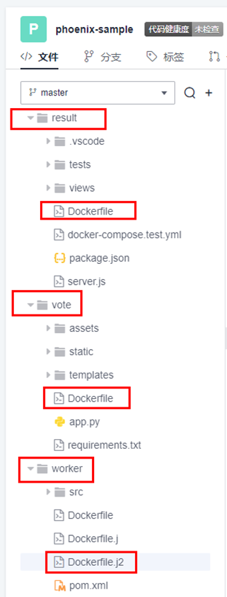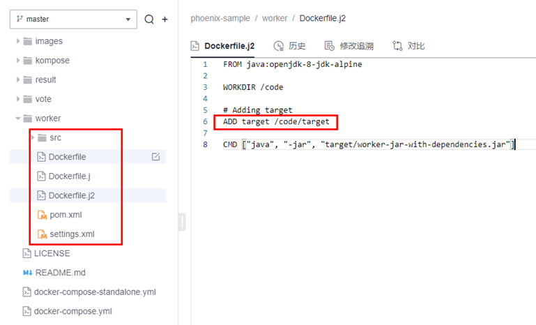 在Dockerfile.j2文件中,将target下的内容复制到code/target下,但是target文件夹又并不在代码当中。这是因为worker下的项目是Java项目,target文件夹是在Maven构建的过程产生的,所以在构建任务phoenix-sample-ci中,制作Worker镜像之前需要先通过Maven进行构建。