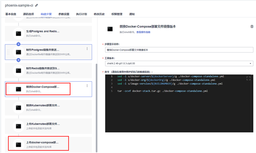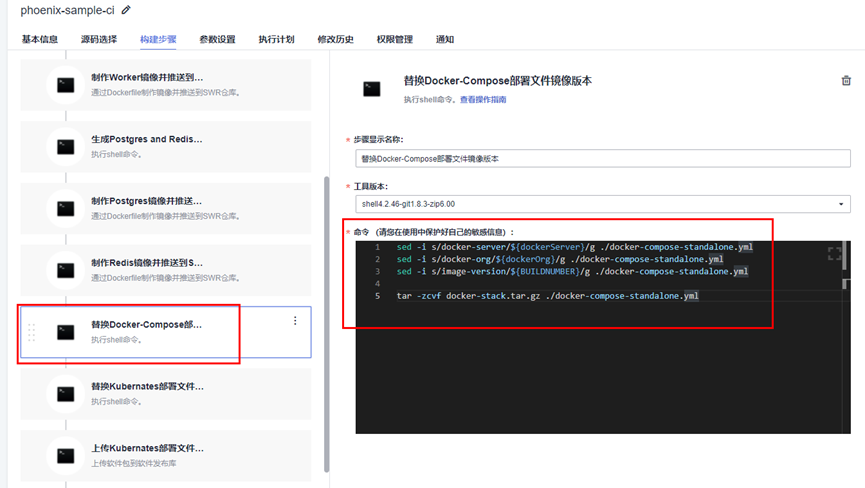 在构建任务phoenix-sample-ci中,“替换Docker-Compose部署文件镜像版本”步骤的shell命令正是将docker-compose-standalone.yml文件中的docker-server、docker-org、image-version三处替换为我们在该构建任务中定义的三个参数dockerServer、dockerOrg、BUILDNUMBER。
