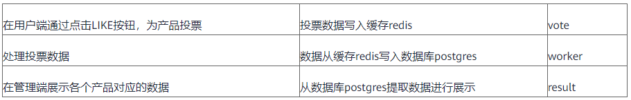 其实在完成代码解构之后,整个项目已经非常清晰了。代码中包括vote、result、worker三个功能模块,项目还用到了redis和postgres两个第三方应用。所以,我们在编译构建环节的主要目的就是把这些服务的镜像制作出来并上传到SWR容器镜像仓库中。