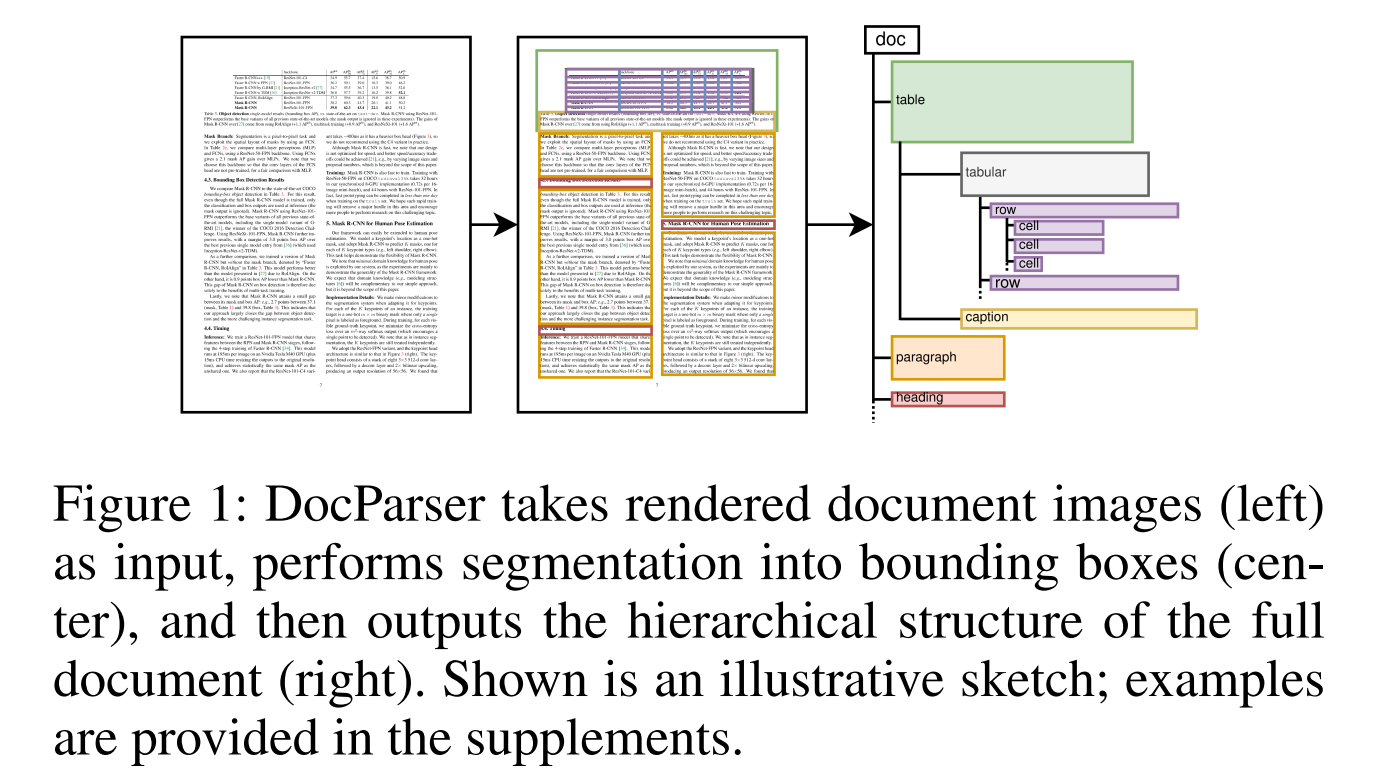 提出一个端到端的文档结构分析方案(DocParser),对文档(扫描版、图片版等)进行结构提取,包括实体识别(这里实体指所有需要检测的元素,包括文本、行、列、单元格等)和关系分类。 基于TEX和synctex,通过反向生成TEX代码生成弱监督标签。