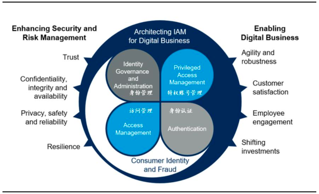 从功能划分的角度,身份安全一般又可称为身份与访问管理(IAM)。根据Gartner的分类,IAM包含了身份管理、访问管理、特权账号管理以及身份认证四个部分。身份是一切安全的基础。