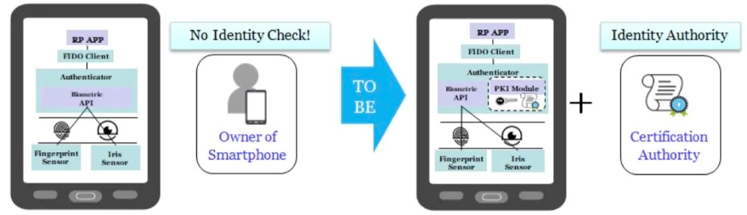 FIDO利用安全协议实现了用户的快速身份认证,从而证明用户是该设备的合法使用者,但FIDO不能证明应用使用者的真实身份,特别是应用需要高安全级别认证时。所以,还需要结合数字证书实现第三方身份认证。同时,使用合法的数字证书和密码产品和服务,才能满足我国密码合规性等要求。