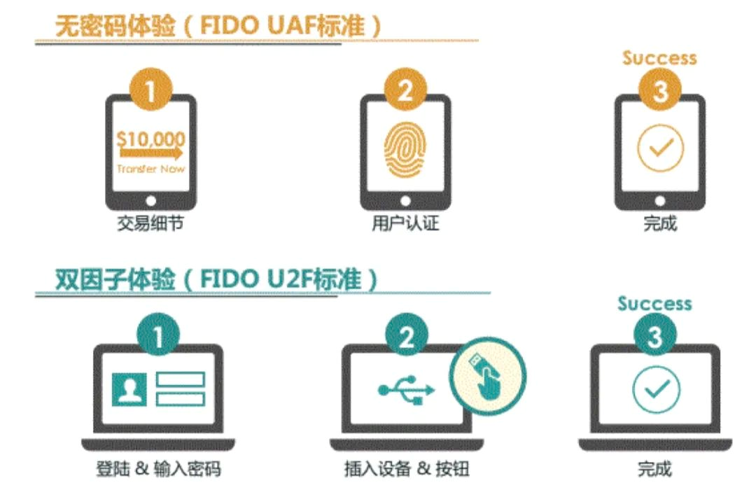 FIDO支持两种认证协议,UAF和U2F。用户的直观体验如下图所示。