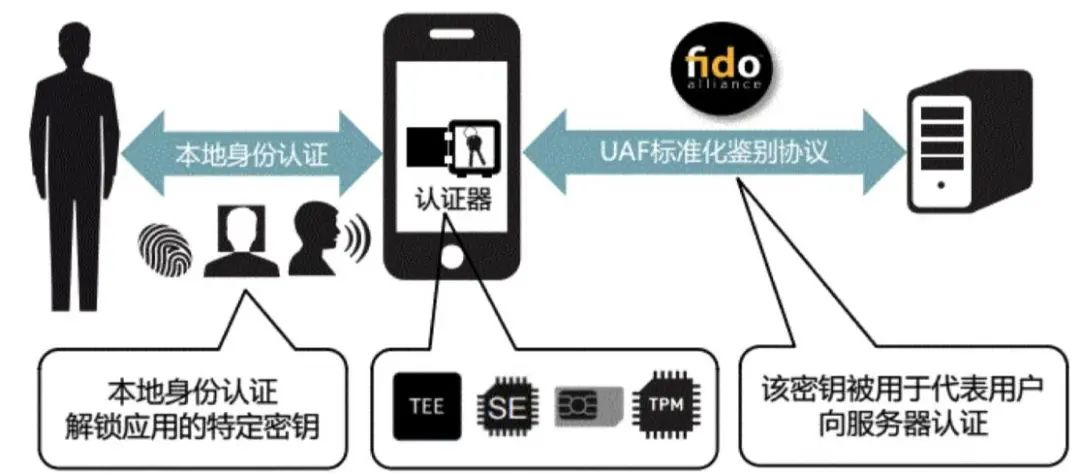 一方面,在本地安全硬件的支撑下完成方便灵活的本地身份认证,获得与应用绑定的特定密钥;同时使用UAF协议建立安全通道,使用该密钥在FIDO服务器完成“在线身份认证”。