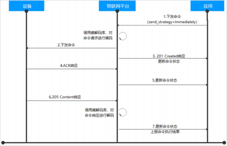 由于使用MQTT是不需要编解码插件的,直接使用透传的形式,当命令立即下发时,应用下发命令到物联网平台,平台将命令下发至设备,返回执行结果,消息执行结果通知。