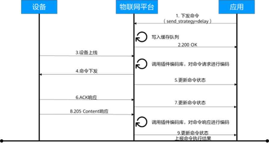 应用下发命令到物联网平台,平台会根据对应的产品信息找到对应的编解码插件,对命令请求进行编码,将命令下发给设备;下发命令成功或失败,会根据下发结果更新命令状态,若设备对命令做出了响应,会将命令状态更新为“执行成功”或“执行失败”。