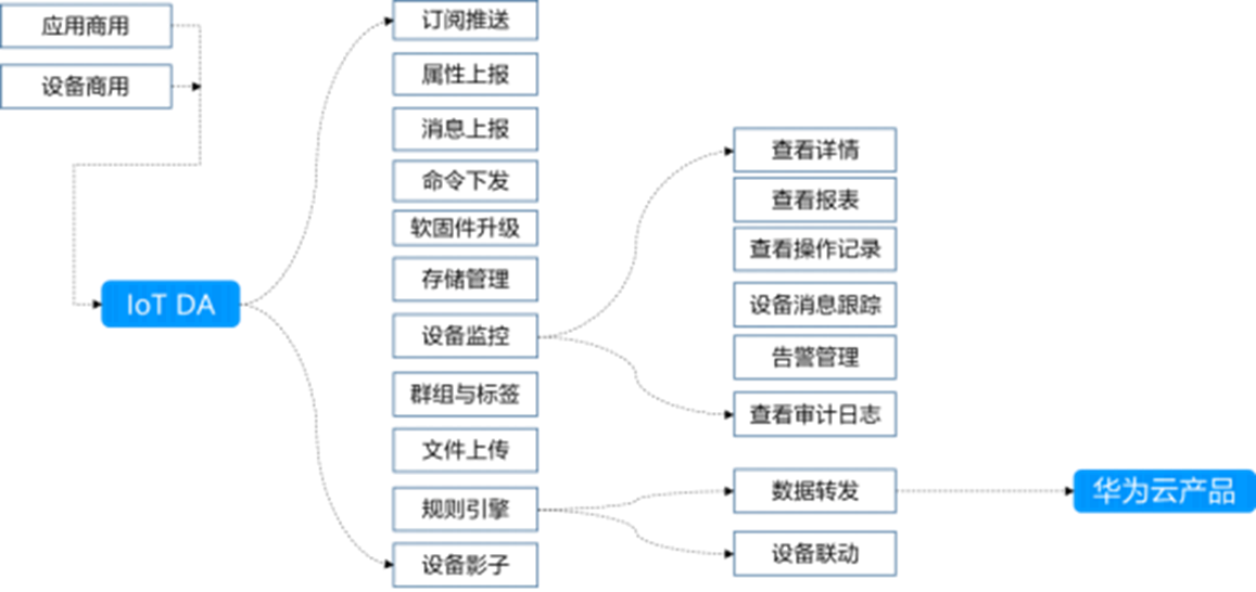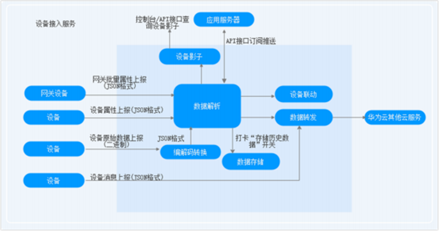 设备消息上报:设备可以通过消息上报接口将设备的自定义数据上报到平台,平台对设备上报的消息不进行解析和存储,通过数据转发规则转发到华为云其他云服务上进行存储和处理,然后通过其他云服务的控制台或者API接口进行进一步的数据处理。