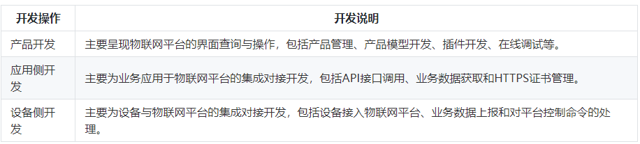 产品开发:开发者在进行设备接入前,基于控制台进行相应的开发工作,包括创建产品、创建设备、在线开发产品模型、在线开发插件、在线调试、自助测试和发布产品。