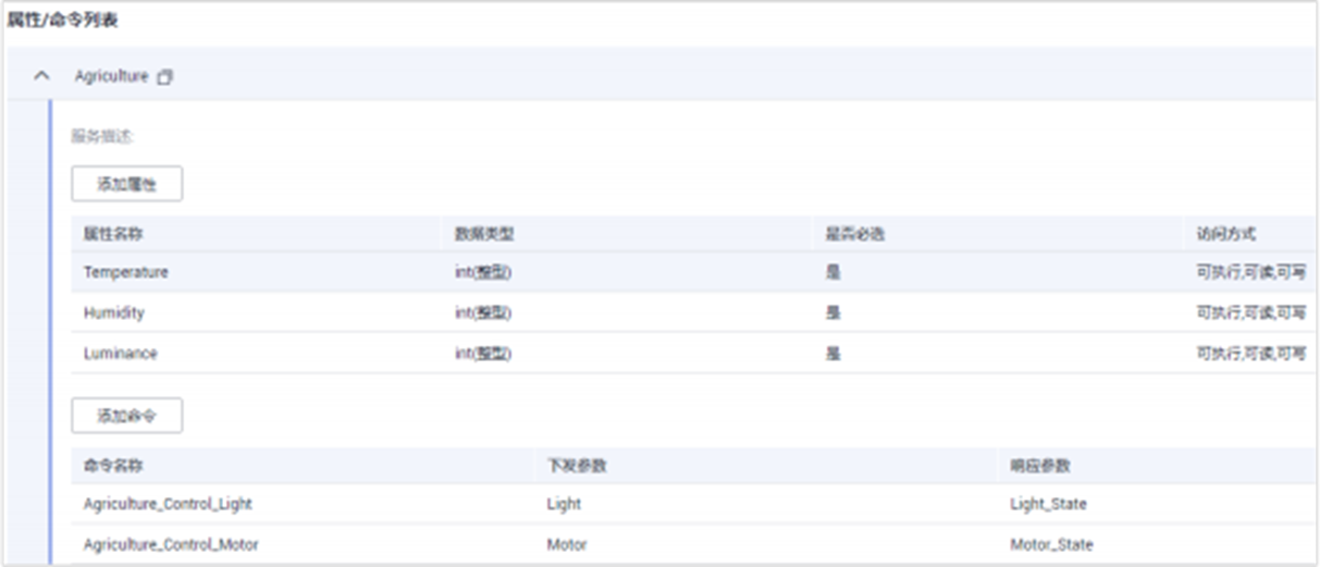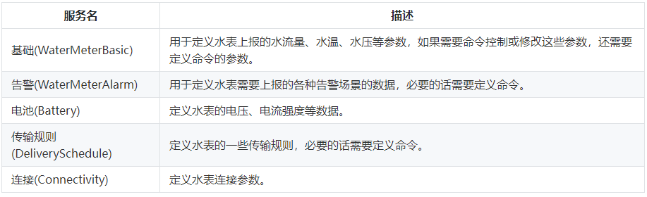 服务能力:描述设备具备的业务能力。将设备业务能力拆分成若干个服务后,再定义每个服务具备的属性、命令以及命令的参数。以水表为例,水表具有多种能力,如上报水流、告警、电量、连接等各种数据,并且能够接受服务器下发的各种命令。产品模型文件在描述水表的能力时,可以将水表的能力划分五个服务,每个服务都需要定义各自的上报属性或命令。