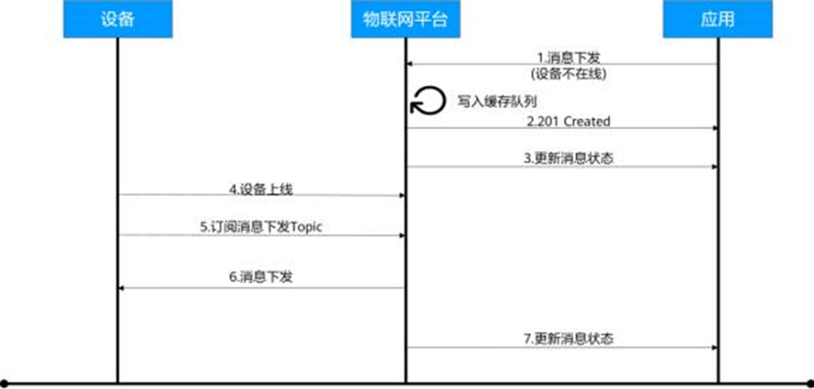 应用缓存下发命令,当设备不在线时,将命令写入缓存队列,更新消息状态,直到设备上报数据,设备上线,订阅消息下发Topic,消息下发,更新消息状态。