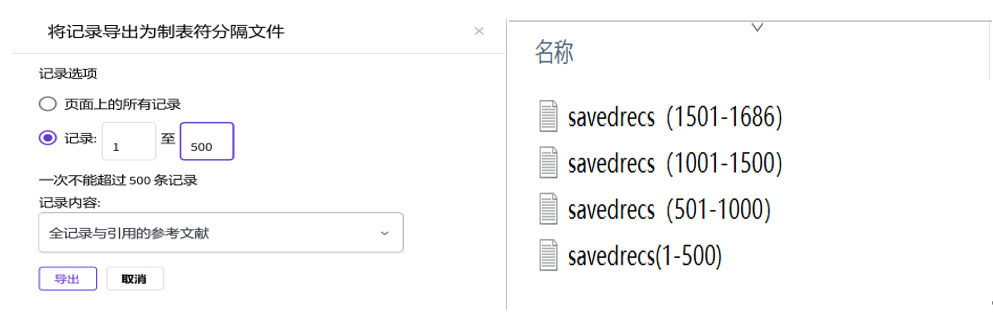 需要注意的是,导出格式应选择为“制表符分隔文件”,记录内容为“全记录与引用的参考文献”。因为一次只能500条,所以要分四次下载。