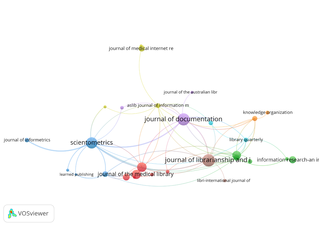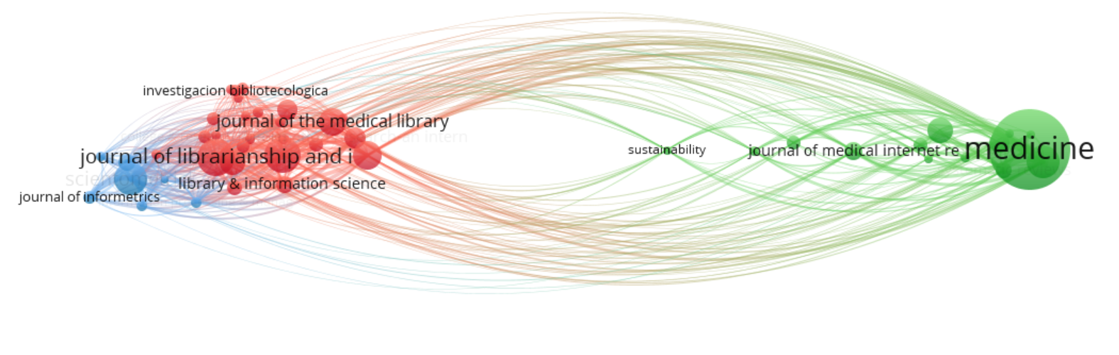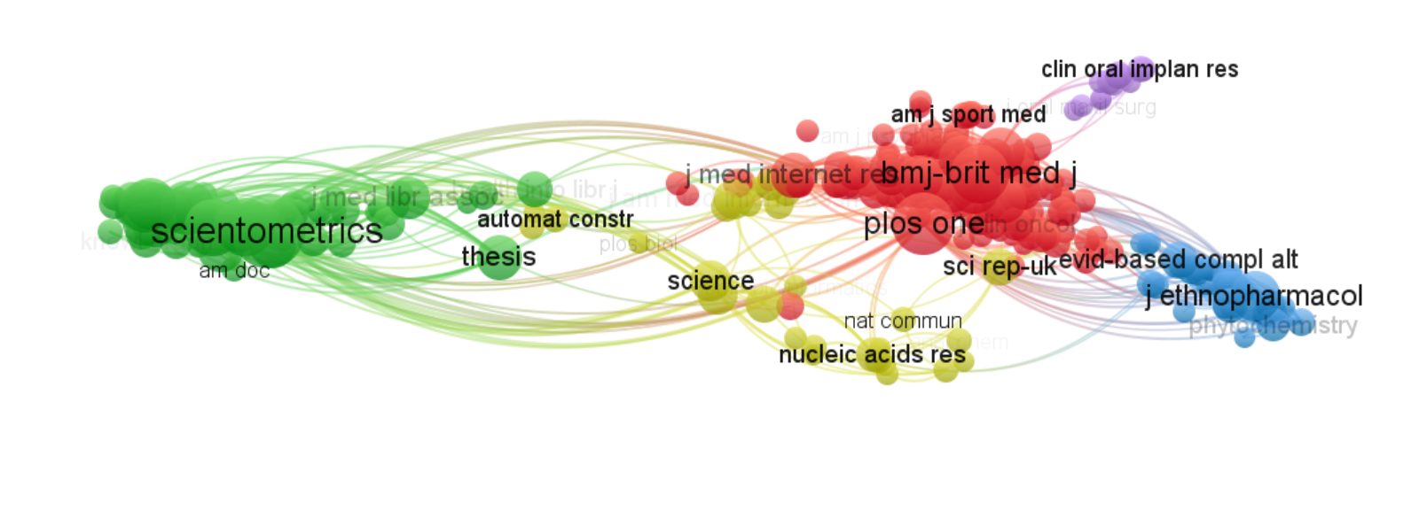 从图中可以看到,节点越大表示期刊的重要性越高。绿色的是科学计量学期刊、,红色的是医学期刊,蓝色的是药理学期刊,黄色的有核酸研究期刊,能够看出最近几年受疫情影响,图书情报领域的研究与医学领域产生交叉。