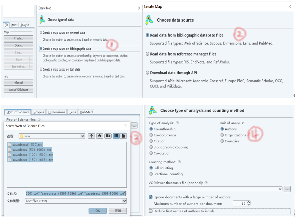 单击左区Map下的create,选择“create a map based on bibliographic data”,导入文献计量数据集,可以生成合作网络分析、关键词共现分析、引证分析、耦合分析、共被引分析的可视化图谱。