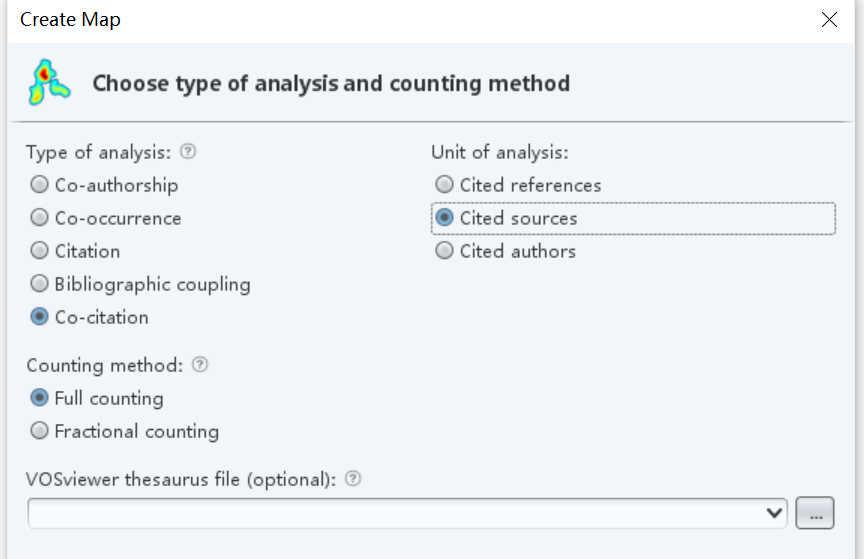 在分析与计数方法设置栏中,分析方法选择co-citation,分析单元选择cited souces(当然你也可以根据需要选择其他的方法~)