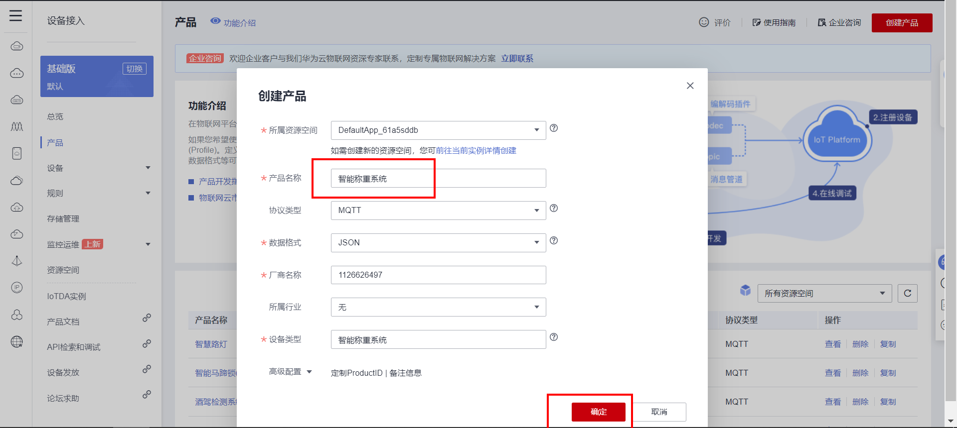 (5)物联网云平台:采用华为云物联网平台