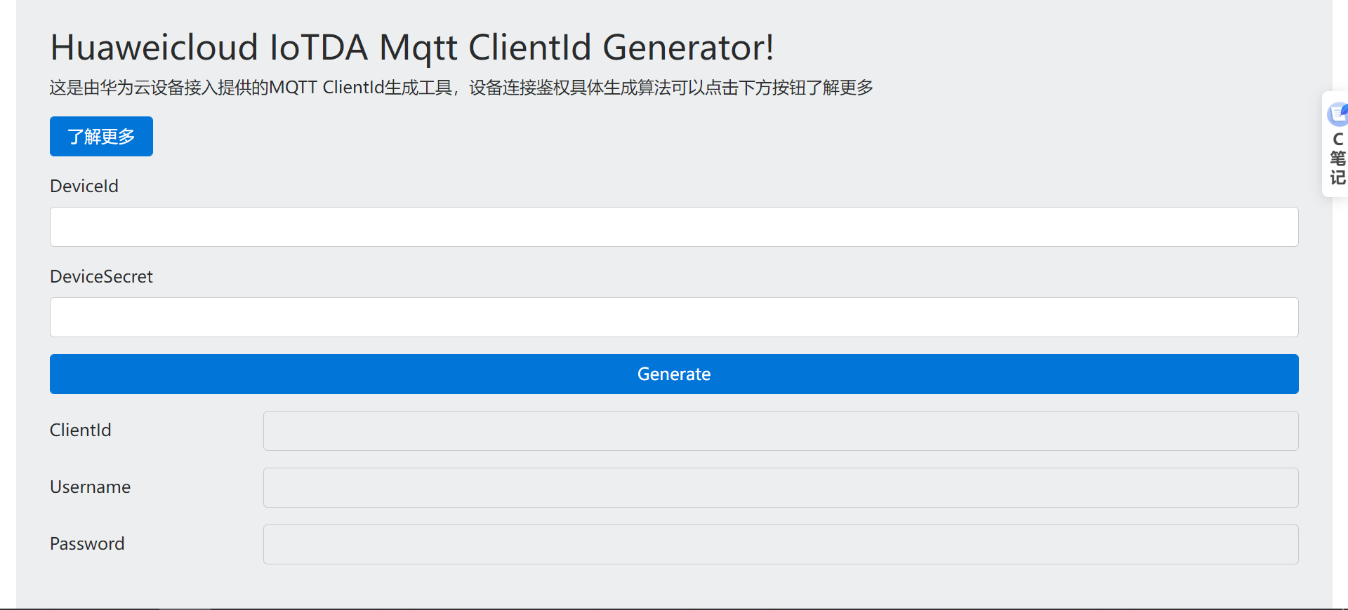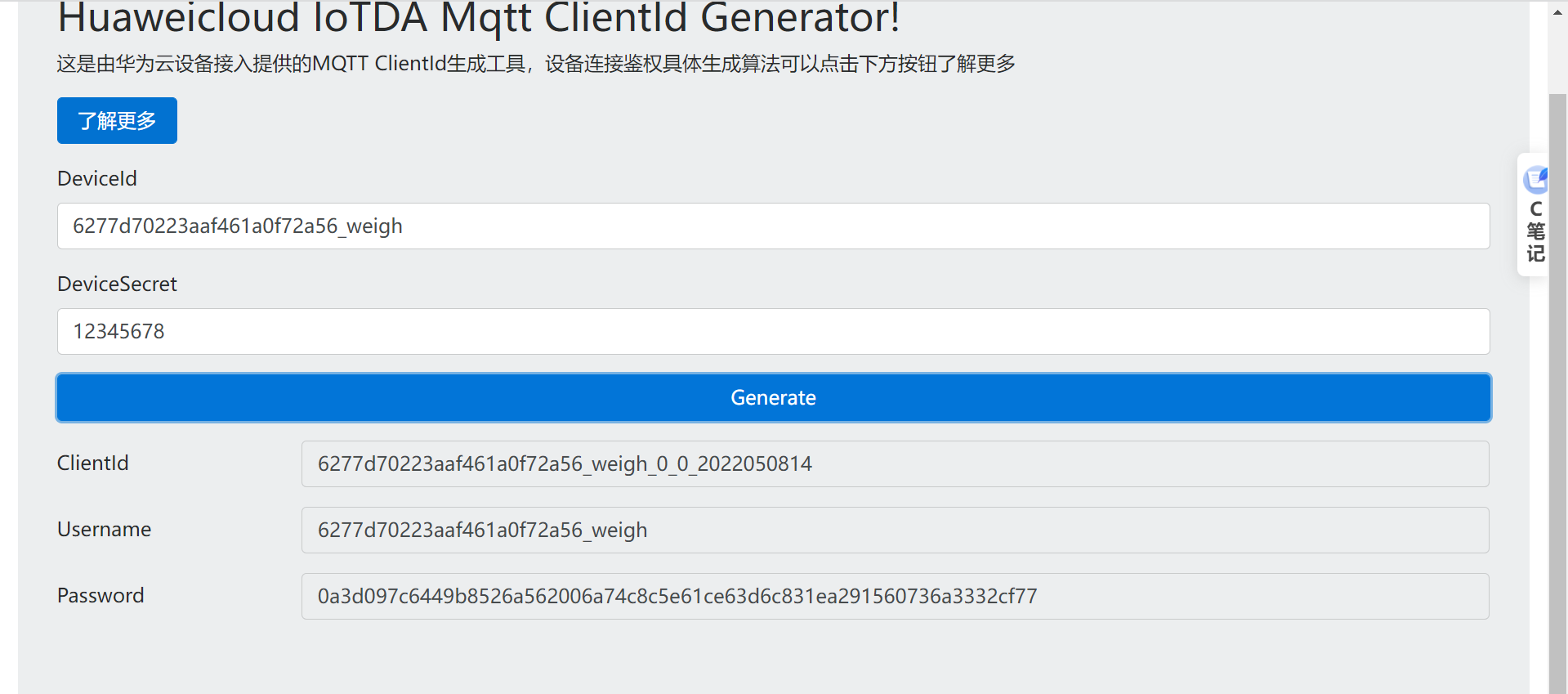 MQTT设备登陆密匙生成地址: https://iot-tool.obs-website.cn-north-4.myhuaweicloud.com/