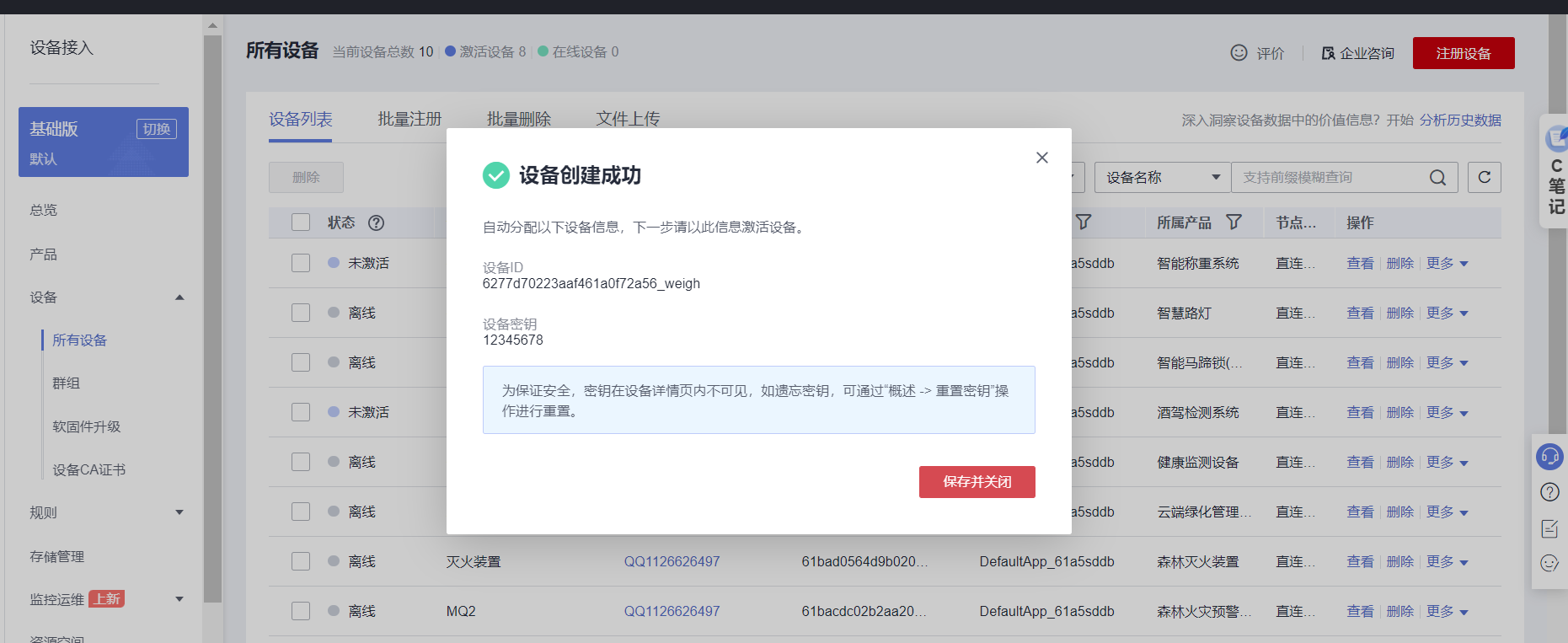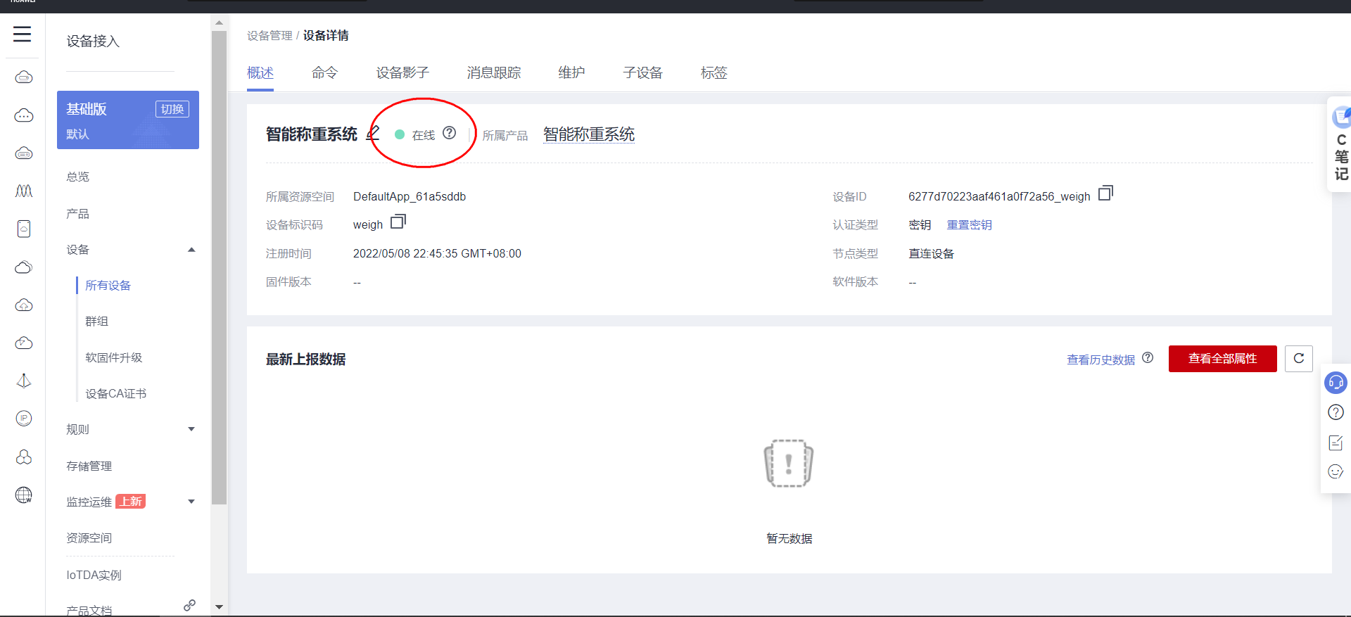 接下来打开设备页面,可以看到设备已经在线了。