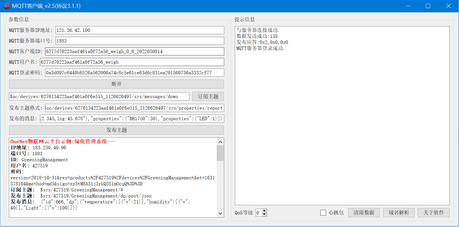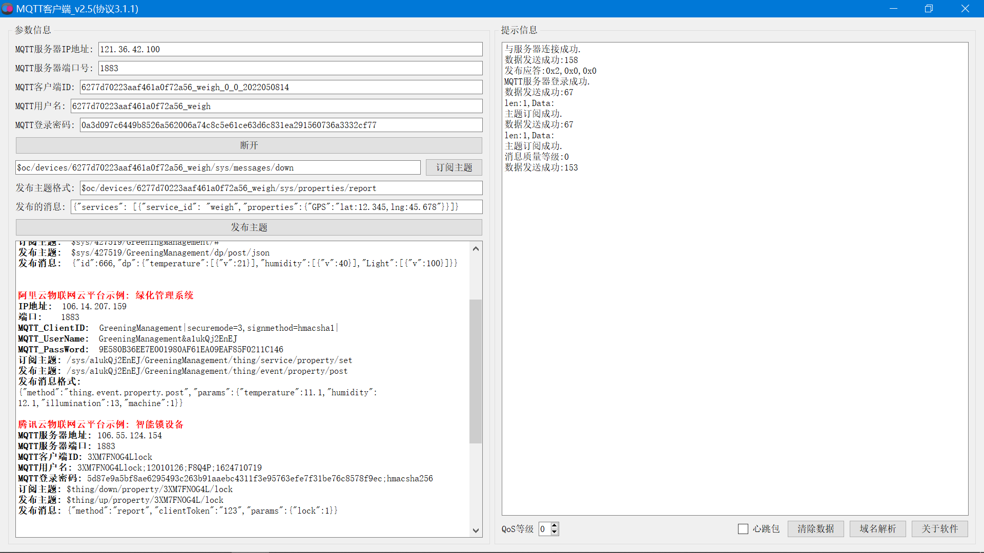 DeviceId 6277d70223aaf461a0f72a56_weigh DeviceSecret 12345678 ClientId 6277d70223aaf461a0f72a56_weigh_0_0_2022050814 Username 6277d70223aaf461a0f72a56_weigh Password 0a3d097c6449b8526a562006a74c8c5e61ce63d6c831ea291560736a3332cf77