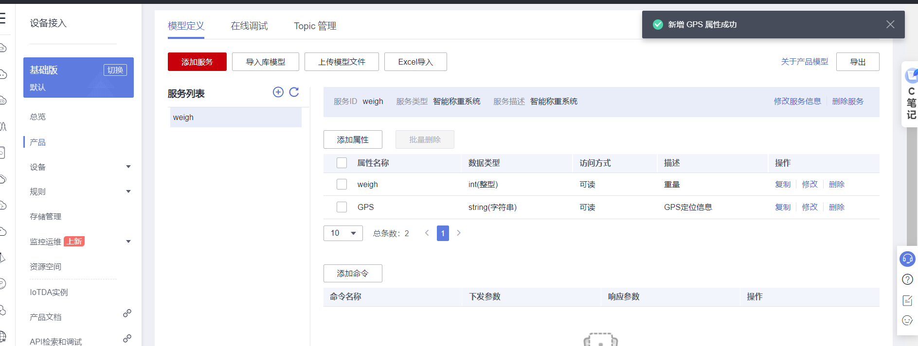 //订阅主题: 平台下发消息给设备 $oc/devices/6277d70223aaf461a0f72a56_weigh/sys/messages/down //设备上报数据 $oc/devices/6277d70223aaf461a0f72a56_weigh/sys/properties/report //上报的属性消息 (一次可以上报多个属性,在json里增加就行了) {"services": [{"service_id": "weigh","properties":{"GPS":"lat:12.345,lng:45.678"}}]}