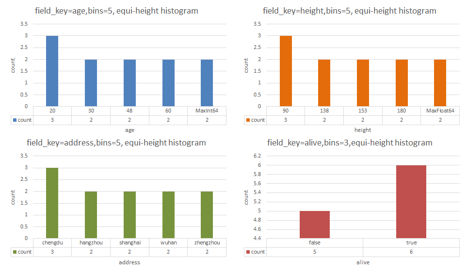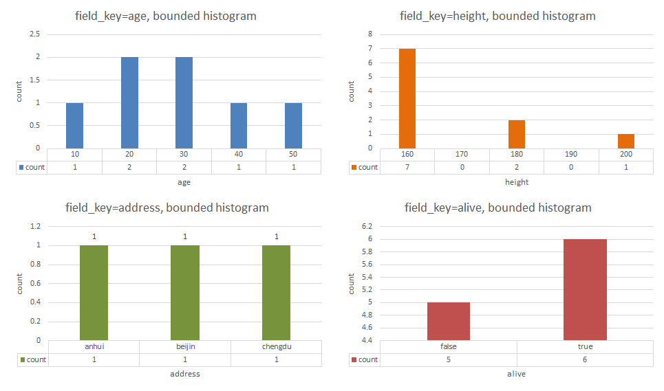 3、支持field为字符串类型的address与布尔类型的alive的等高直方图查询。