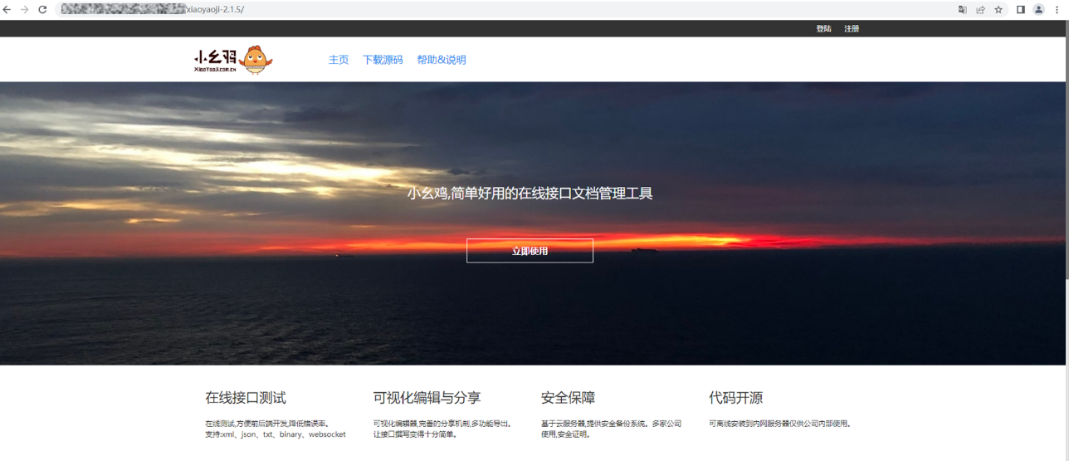 部署完成后就可以通过约定的方式访问应用程序。如http://ECS公网IP:端口号或者http://ECS公网IP:8080/xiaoyaoji-2.1.5的形式,其中ECS公网IP即之前步骤里创建的ECS的公网IP,下图为“小幺鸡”在线文档管理平台的访问界面。