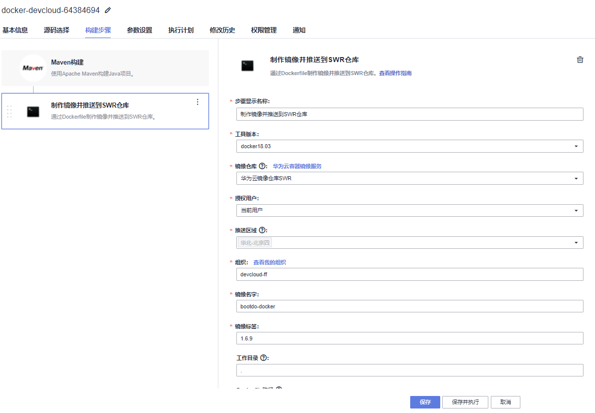 制作镜像并推送到SWR仓库步骤,会通过Dockerfile制作镜像文件并推送到SWR容器镜像服务里,用于后续的部署。此处将组织、镜像名字、镜像标签设置为正确的值(组织需要在SWR中自行创建,可通过点击组织后的“查看我的组织”按钮进入)。