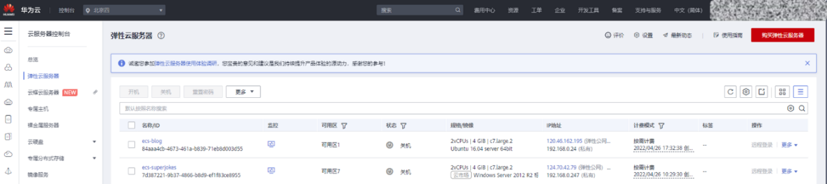 实验中用到的付费资源就是弹性云服务器ECS,下面是我在实验中用到的两台主机,在不用的时候删除或者关机就会停止计费。有些主机当时用完就释放了。