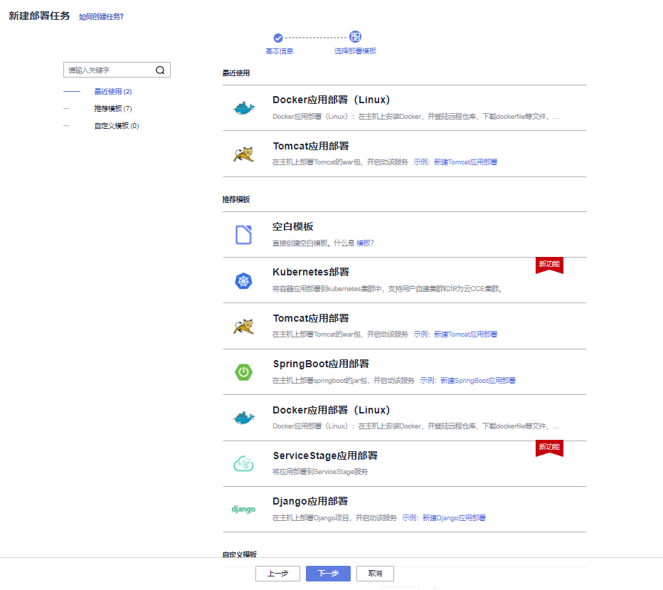 三个项目的部署也各不相同,有的是通过Shell命令部署,有的是Tomcat部署,主机环境也有CentOS 7.6和Ubuntu16.04之分,这些在华为云的部署服务和ECS产品都能够支持和实现。在部署时候也有推荐模板和空白模板两种。