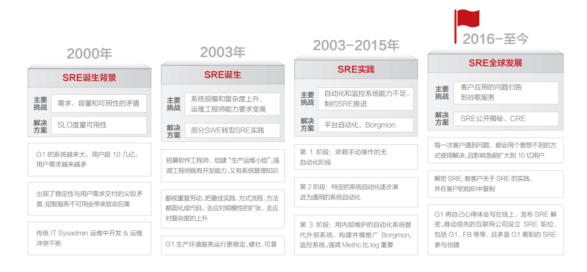 SRE(Site Reliability Engineer)从2003年被谷歌公司提出,已经将近20年,它不仅是一个岗位,而是一个体系化的工程。最早谷歌公司提出SRE是为了解决两个核心冲突点:1、开发、运维两个团队在上线速度和现网系统稳定性之间的冲突;2、软件的快速上线,模糊了运维和研发的边界。谷歌SRE通过软件工程技术,持续改进现网可用性和自动化运维能力,SRE作为一个新的技术岗位走上历史舞台。