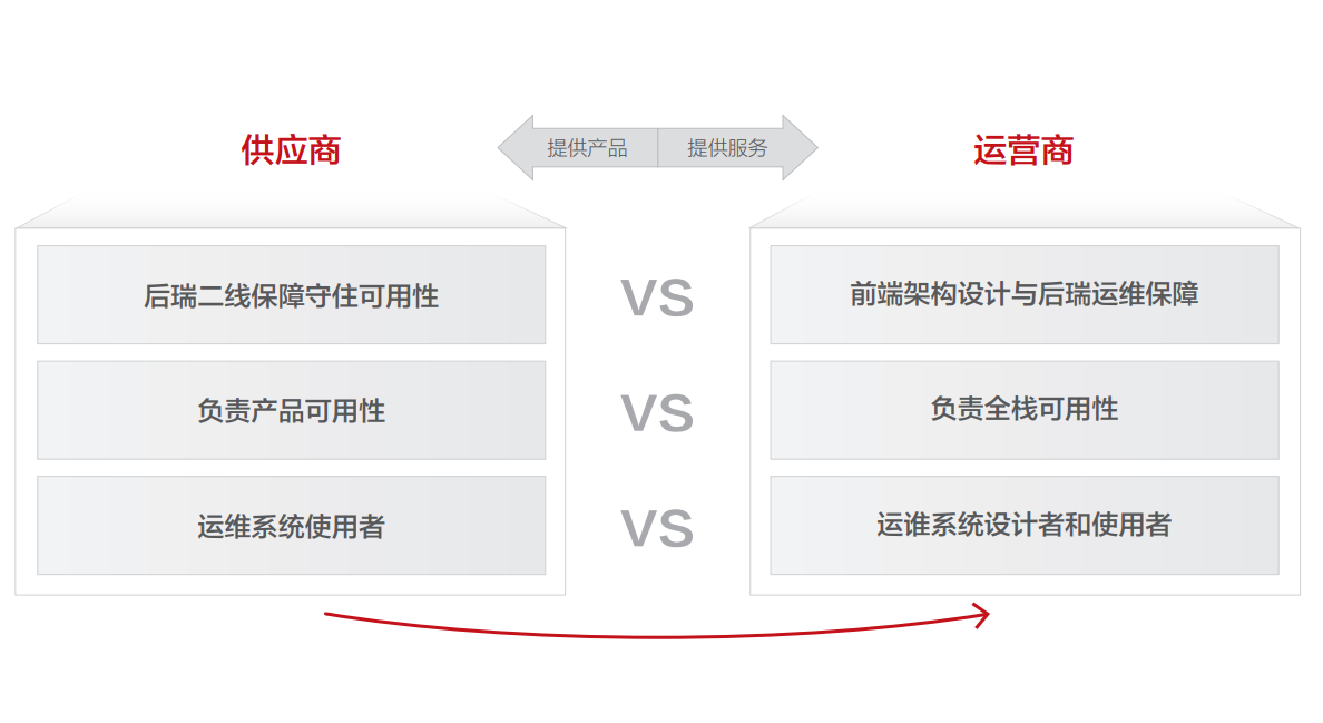 1)商业模式转变导致运维的责任边界产生变化,传统模式客户服务运维,厂家做二线保障。现在需要端到端负责可用性设计以及1/2线运维,这种模式下,仅靠后端保障可用性是不够的,需要介入前端顶层架构设计。