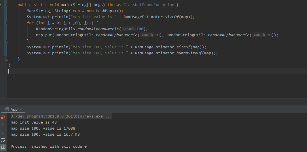 Map<String, String> map = new HashMap<>(); System.out.println("map init value is " + RamUsageEstimator.sizeOf(map)); for (int i = 0; i < 100; i++) { RandomStringUtils.randomAlphanumeric(100); map.put(RandomStringUtils.randomAlphanumeric(10), RandomStringUtils.randomAlphanumeric(10)); } System.out.println("map size 100, value is " + RamUsageEstimator.sizeOf(map)); System.out.println("map size 100, value is " + RamUsageEstimator.humanSizeOf(map));