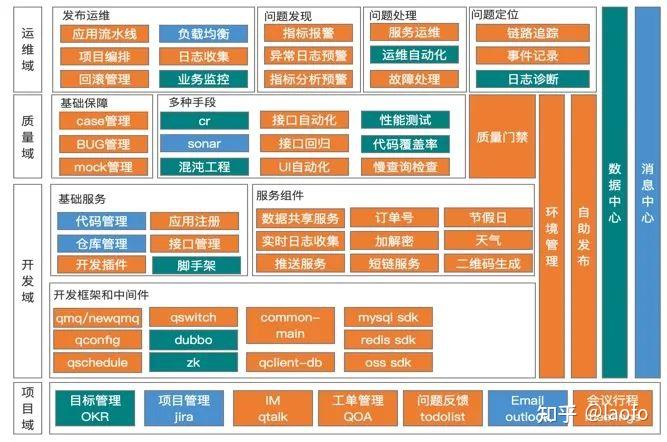 贯穿全部流程的是项目管理。在上层,我们根据不同的域进行了拆分,可拆分为开发、测试、上线和运维。