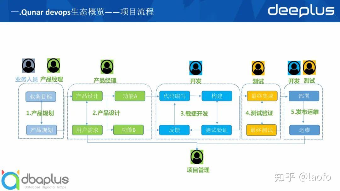 在整个项目流程中,首先是业务,我们做DevOps的时候一定要从业务目标出发,业务人员先去确定业务目标,然后进行产品的规划,规划完成之后进行产品的设计。设计拆分成具体的功能,功能对应我们的需求。在需求出来之后,我们进行敏捷开发。开发完成后进行集成测试验证,最终发布运维上线。我们DevOps其实主要是致力于为产品设计到发布运维这一过程提供支持,完成服务目标。整个过程也是我们项目管理的过程。