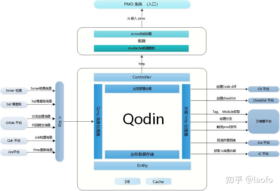 相当于开发与应用关联的工具,我们内部把它叫做Qodin,底层是DB,Cache,其次是我们的数据存储,然后各个工具平台会把自己执行的一些结果通过发送消息推送到我们的消息平台。Qodin通过消费这些消息,通过外部的HTTP接口触发各种工具平台去执行。上层是我们通过js一些页面给用户提供一些查看入口、操作入口等等。