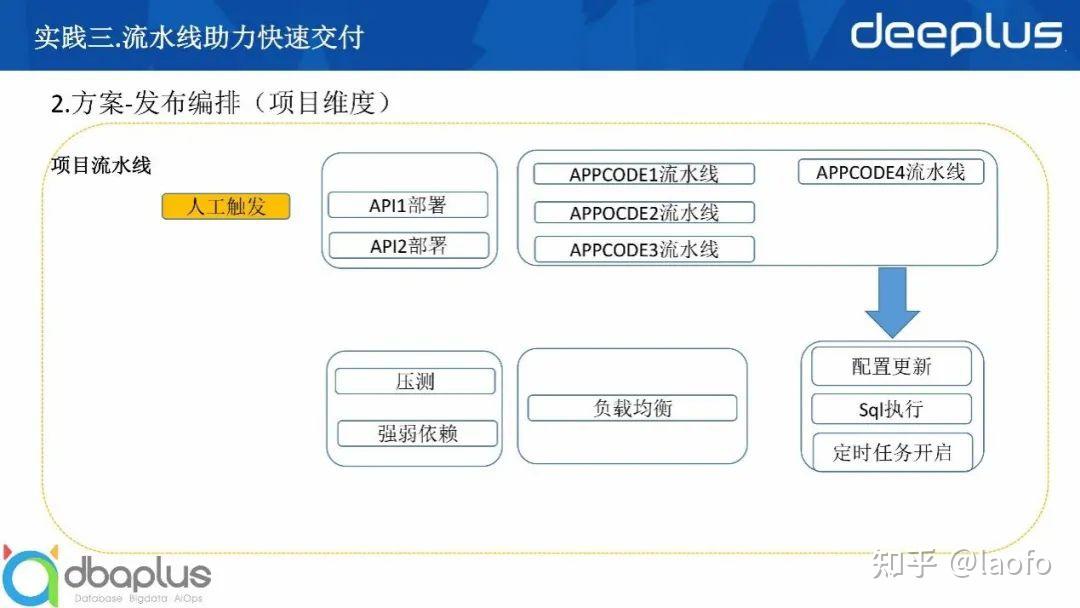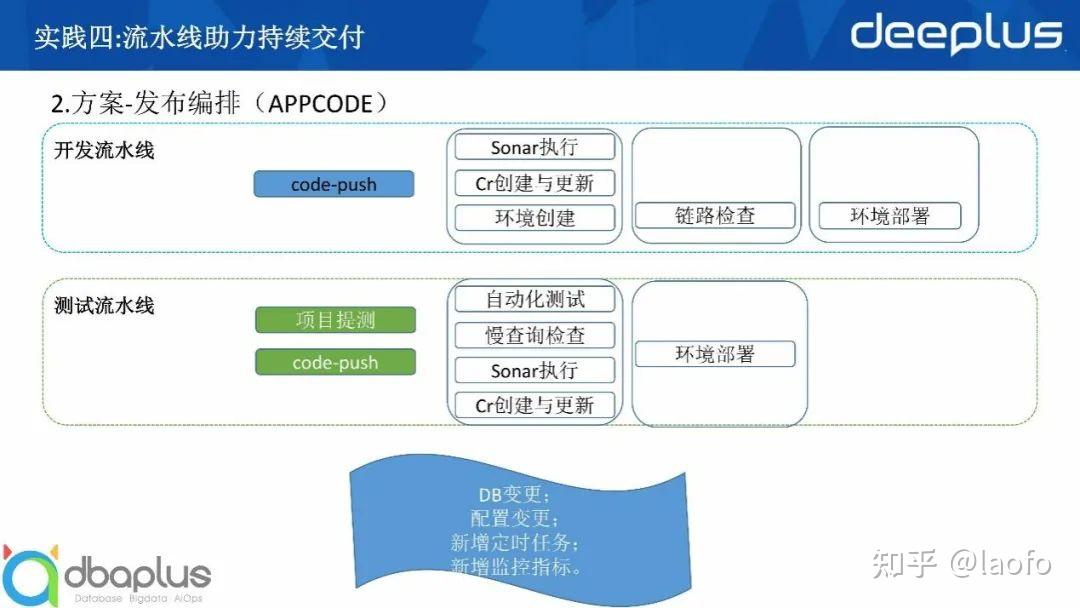 我举个例子,我们开发测试的流水线在这个过程中会产生一些数据,例如DB变更,DB的配置变更,定时任务监控等,这些都可以自动的识别出来,这样的话就可以在线上的时候自动把这些信息拿到,然后业务线只需要改一下Beta和线上的一些不同配置以及具体的值即可,这样我就可以不用人工地去各个地方信息搬运,线上也可以快速地交付。