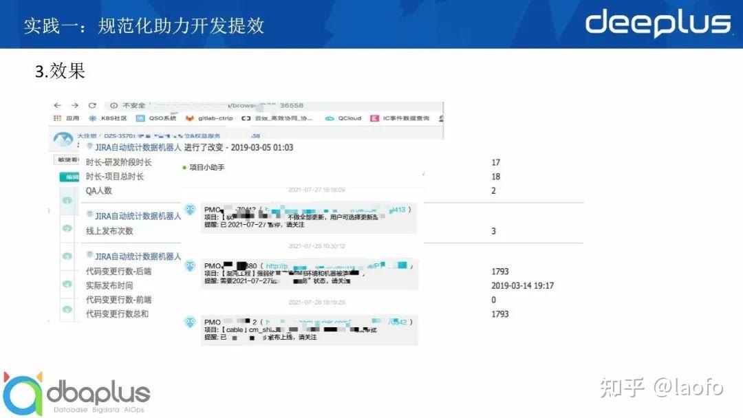 上图是我们的一个项目,我们可以看到这个项目中到底变更了哪些内容,首先是变更的一些质量的情况,以及它的发布情况。其次是我们自动回填的数据,可以看到包括研发阶段的市场自动计算,项目总市场等,线上发布的次数,代码变更的一些信息,同时我们在一些项目的关键节点,根据时间计算关键节点的状态流转以及是否delay,这些都会有一个及时的项目提醒,这样保证了开发和项目经理等都可以及时地关注到整个项目过程,一旦有任何风险也可以及时地暴露出来。