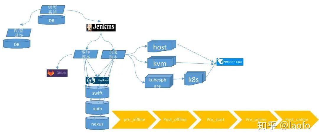 首先是应用确定了自己的应用画像,然后使应用画像存在一个配置系统中,然后调度系统去从配置系统拿到一些配置,完了出发到我们Jenkins,部署到各种的调度资源中。