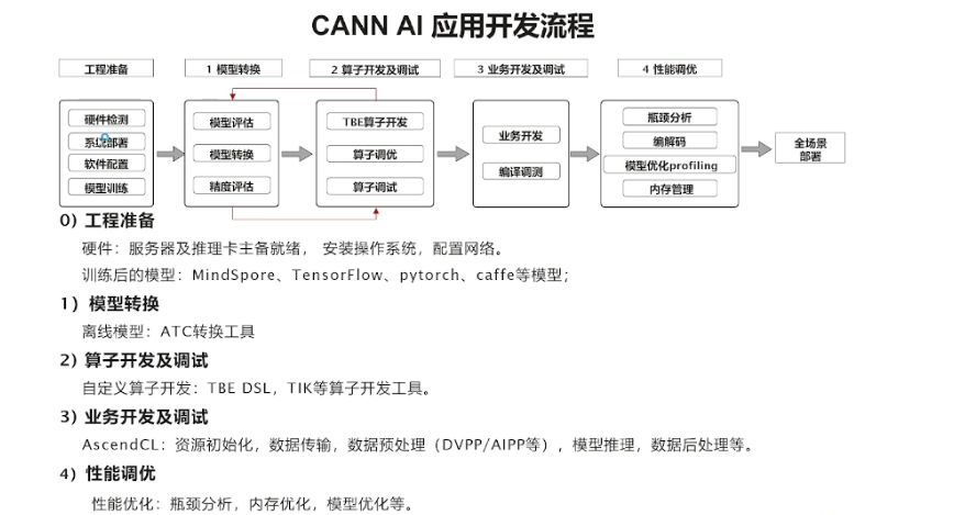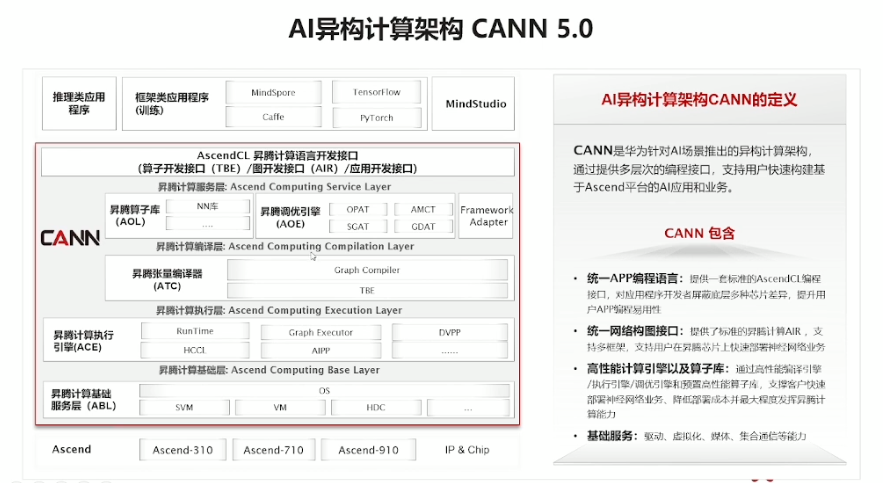 Ascend 310是硬件,我们是基于在硬件上构建的软件进行开发的,不会直接接触到底层的硬件,这里我们是基于CANN开发,CANN(Compute Architecture for Neural Networks)是华为公司针对AI场景推出的异构计算架构,通过提供多层次的编程接口,支持用户快速构建基于昇腾平台的AI应用和业务。包括: