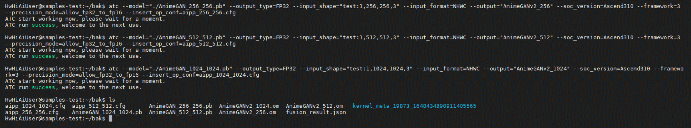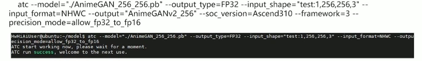 获取到原始模型后,需要使用昇腾CANN所提供的ATC模型转换工具,将第三方框架的模型转换为昇腾推理芯片所支持的om模型。模型转换步骤可参考昇腾文档中开发者文档->应用开发->将已有模型通过ATC工具转换(命令行)的指导进行转换。该样例通过不同分辨率的模型支持三种不同的输入图片,直接影响到生成图片的质量。以下为模型转换过程。