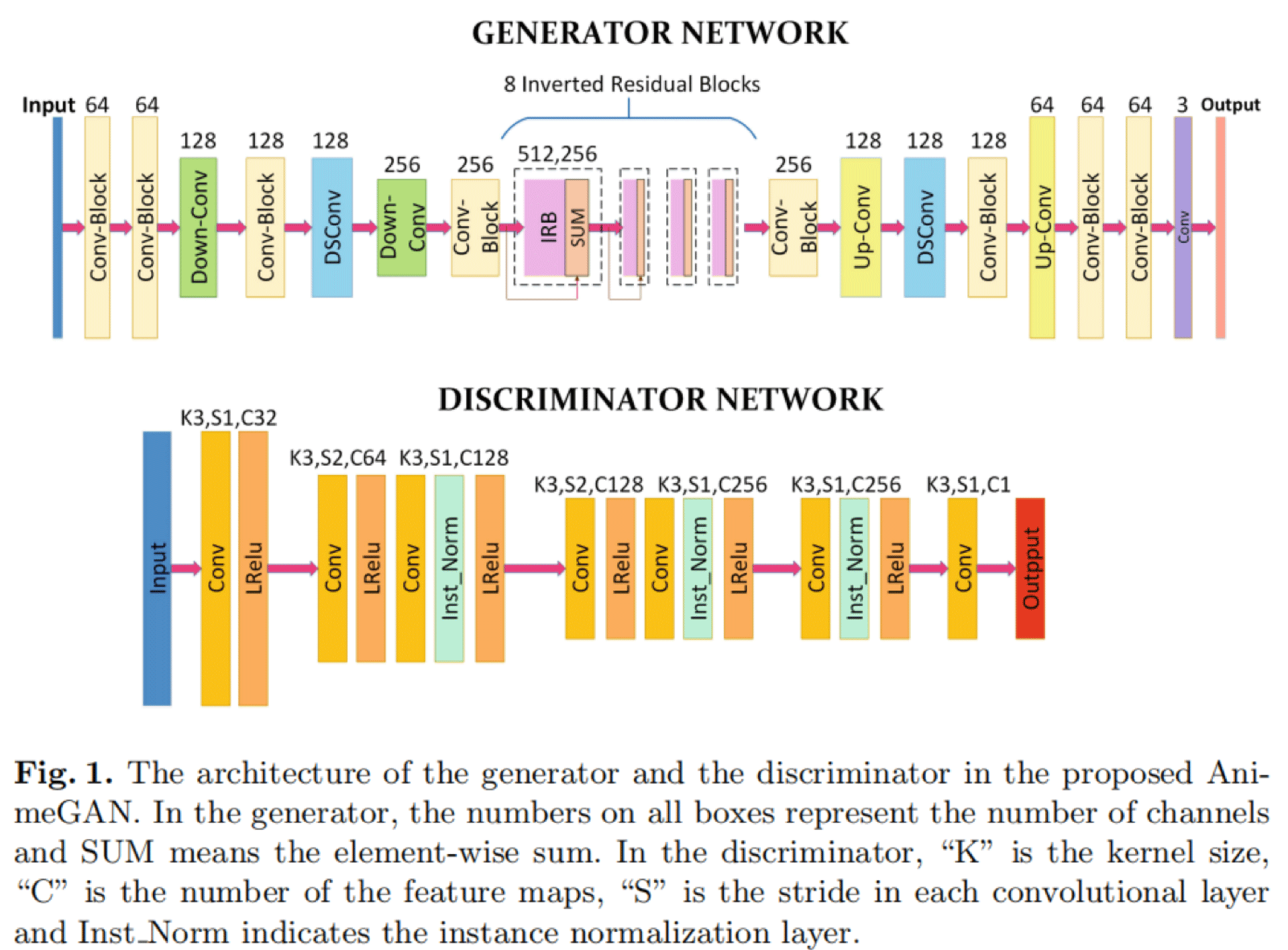 AnimeGAN 的生成器可以被认为是一个对称的编码器-解码器网络。主要由标准卷积、深度可分离卷积、反向残差块(IRB),上采样和下采样模块组成。 在生成器中,最后一个具有 1×1 卷积核的卷积层不使用归一化层,后面是 tanh 非线性激活函数。Conv-Block 由具有 3×3 卷积核的标准卷积、实例归一化层和 LRelu 激活函数组成。 DSConv 由具有 3 × 3 卷积核的深度可分离卷积、实例归一化层和 LRelu 激活函数组成。反转的残差块包含 Conv-Block、深度卷积、点卷积和实例归一化层。