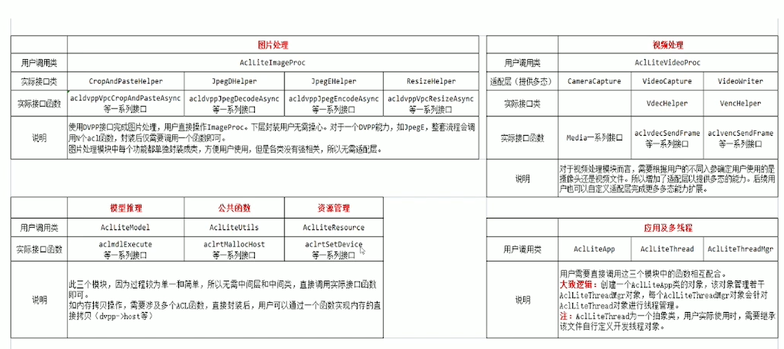 这里我们主要用到的还Ascend CL,也就是ACL,不过为了更加方便开发,减少对原生接口的数据对齐的琐碎限制,我们使用官方推出的进一步封装的acllite,相当于做了进一步封装,更加方便开发者使用。acllite的主要接口如下图所示:
