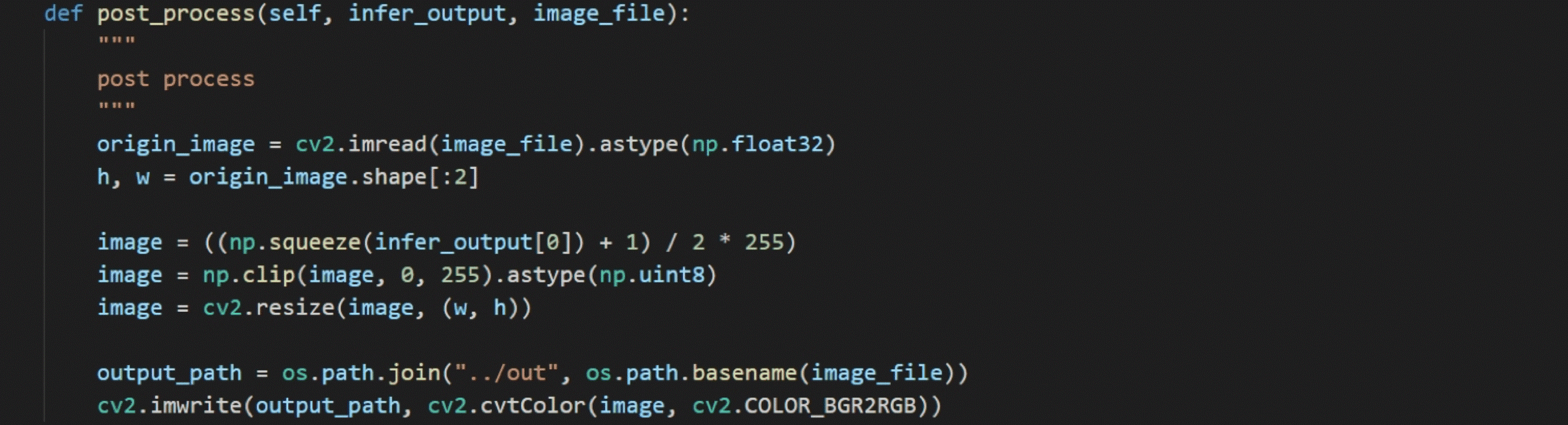 后处理模块主要是对模型的推理结果进行格式变换,然后将变换结果反馈给用户。主要过程是先将-1~1的值映射回0~255,然后将256 × 256的转换结果缩放回原始图像的尺寸大小。最后进行色域转换将RGB格式的输出转换为BGR格式。