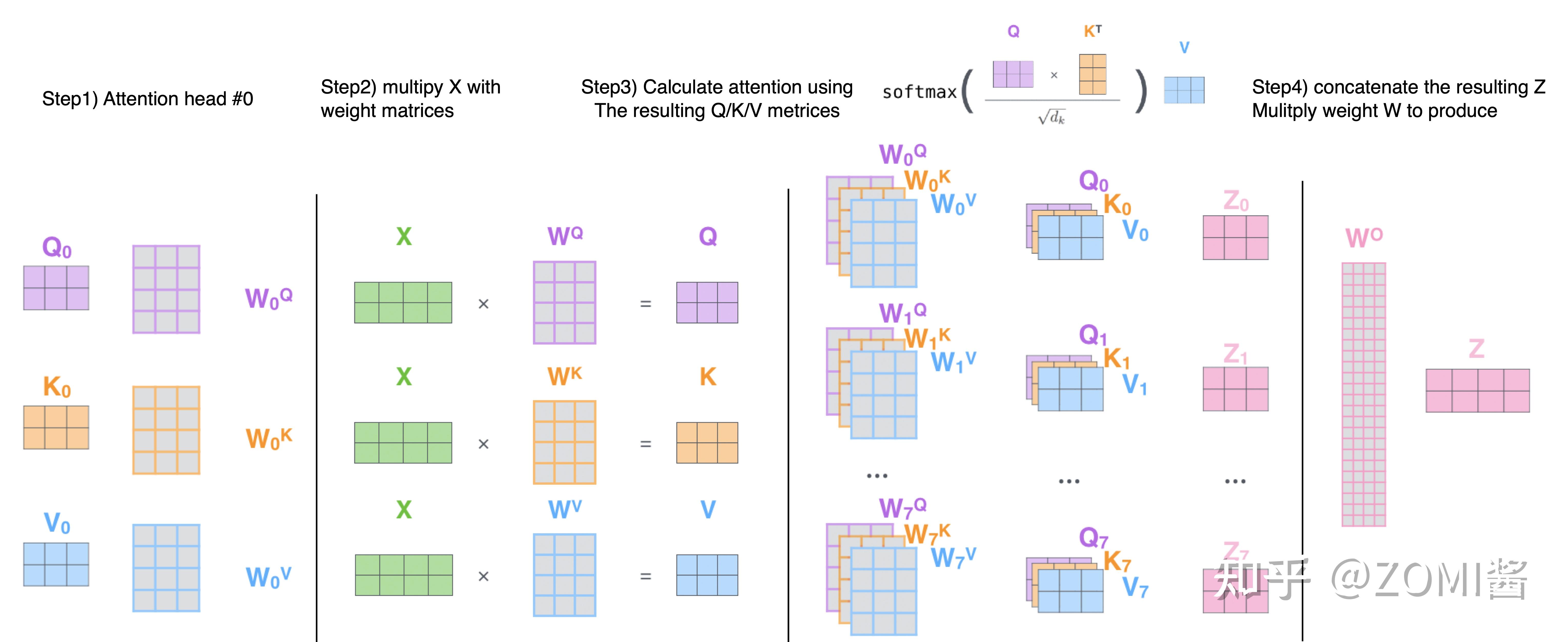 首先有一个 Query 矩阵 Q 和一个 Key 矩阵 K,把二者矩阵乘在一起并进行归一化以后得到 attention 矩阵,它再与Value矩阵 V 相乘得到最终的输出得到 Z。最后经过 linear transformation 得到 NxD 的输出结果。
