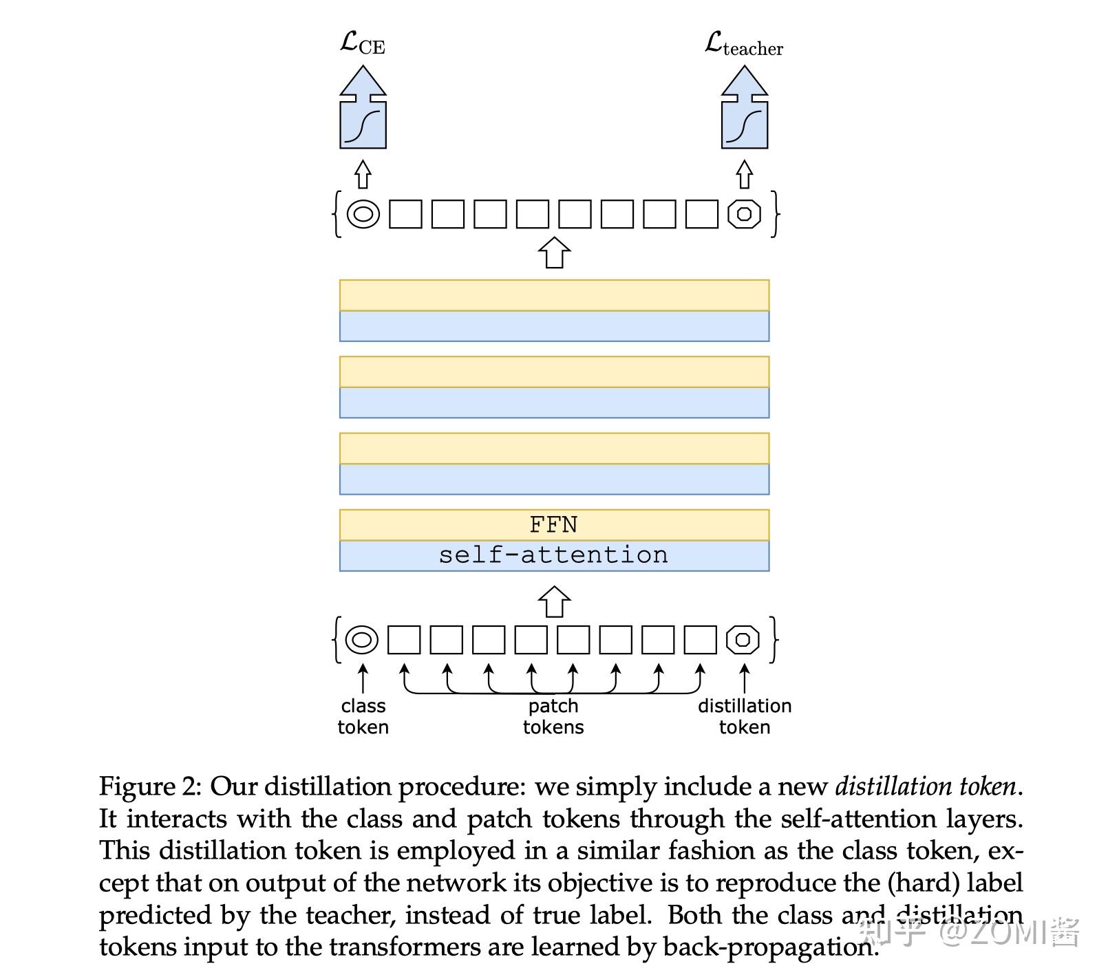 Distillation Token 和 ViT 中的 class token 一起加入 Transformer 中,和class token 一样通过 self-attention 与其它的 embedding 一起计算,并且在最后一层之后由网络输出。