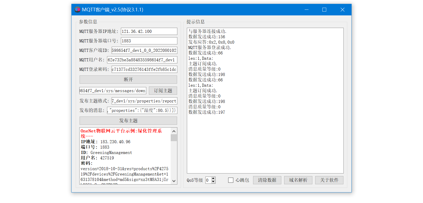 //订阅主题: 平台下发消息给设备 $oc/devices/62e732be3a884835598654f7_dev1/sys/messages/down //设备上报数据 $oc/devices/62e732be3a884835598654f7_dev1/sys/properties/report //上报的属性消息 (一次可以上报多个属性,在json里增加就行了) {"services": [{"service_id": "server_id","properties":{"温度":23.4}},{"service_id": "server_id","properties":{"湿度":80.5}}]}