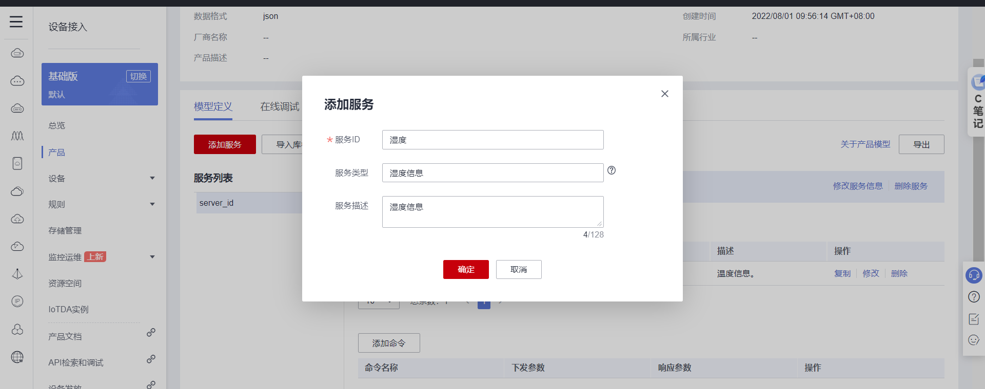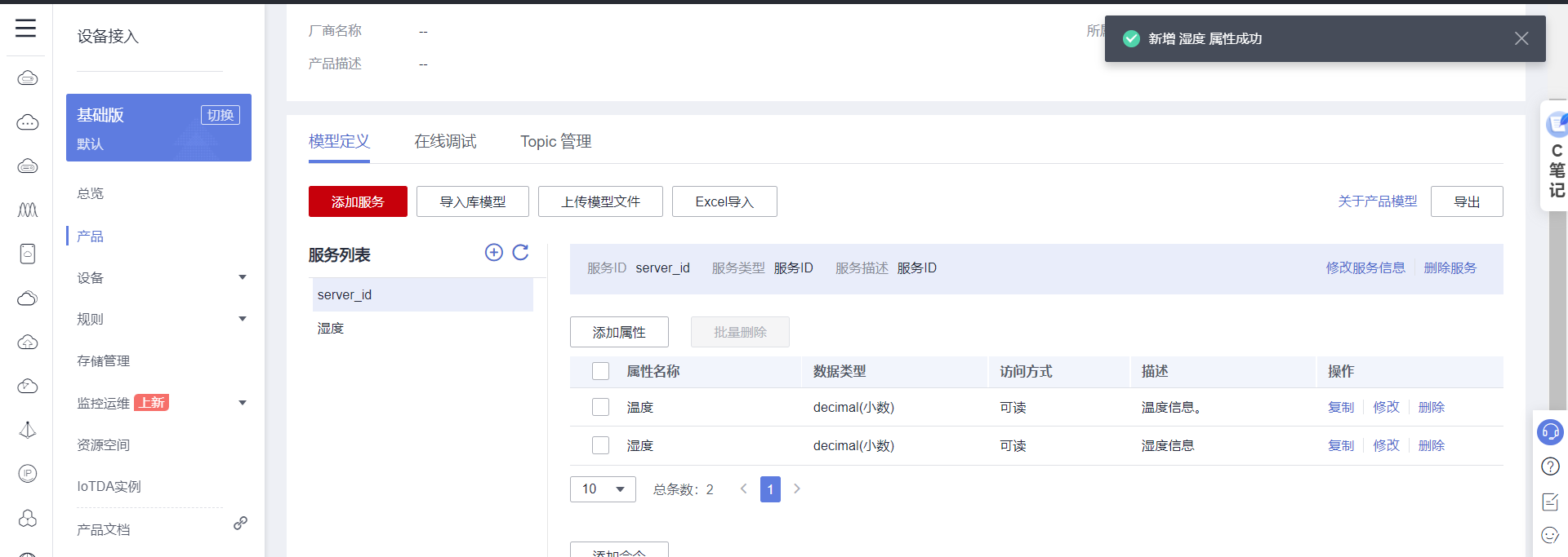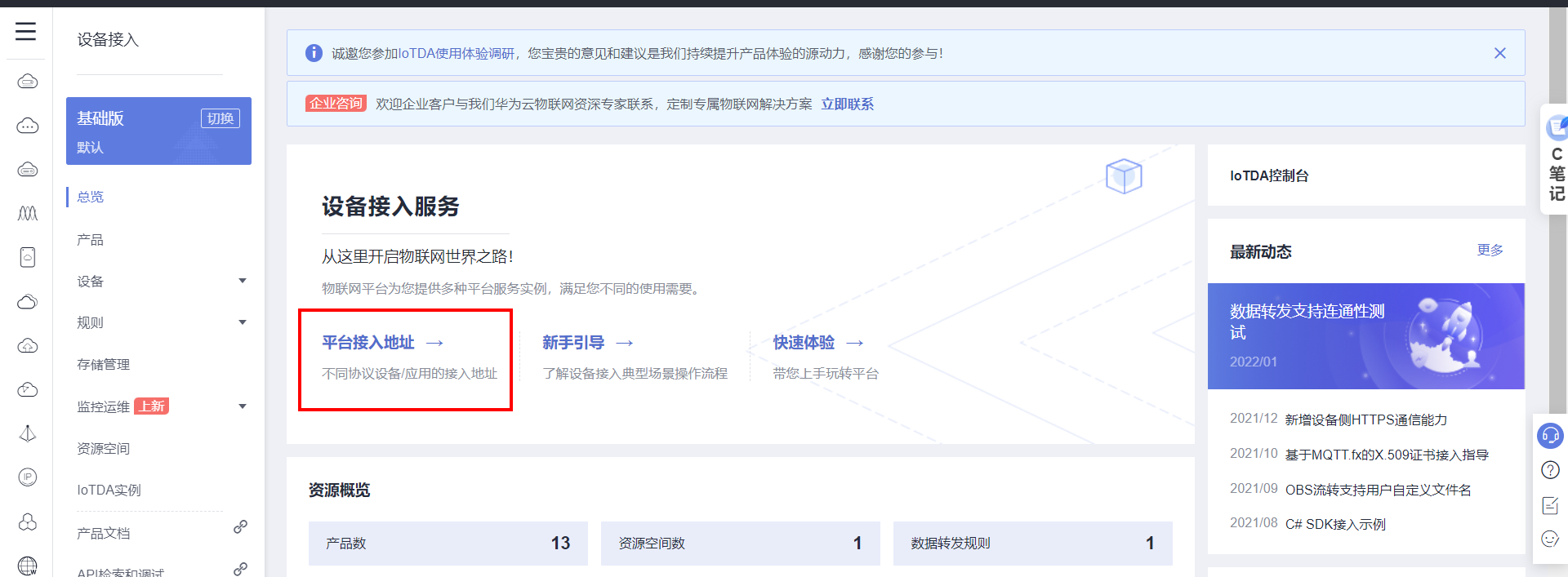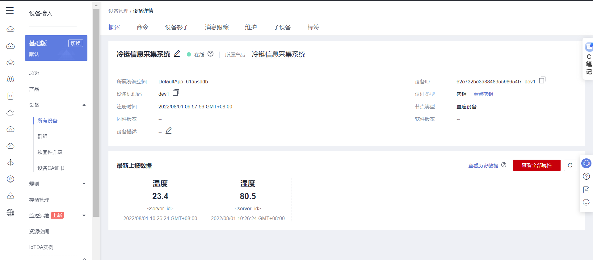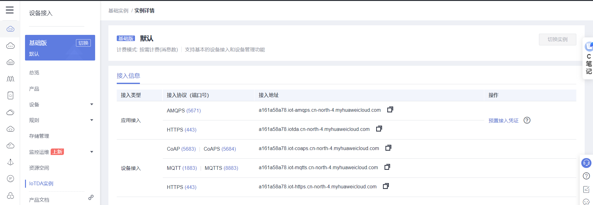 当前的设计中,用的物联网平台服务是华为云的设备接入服务(IoTDA),IoTDA提供海量设备连接上云、设备和云端双向消息通信、批量设备管理、远程控制和监控、OTA升级、设备联动规则等能力,并可将设备数据灵活流转到华为云其他服务。